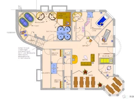 Discover for yourself our relaxation area, with colored light sauna, brine steam bath, shower temple with swallow shower, Kneipp hose, ice rain, tropical rain, massage shower, foot basin (warm/cold) with heated rest bench. Relax with a cup of Ayurvedic tea on our relaxation loungers.